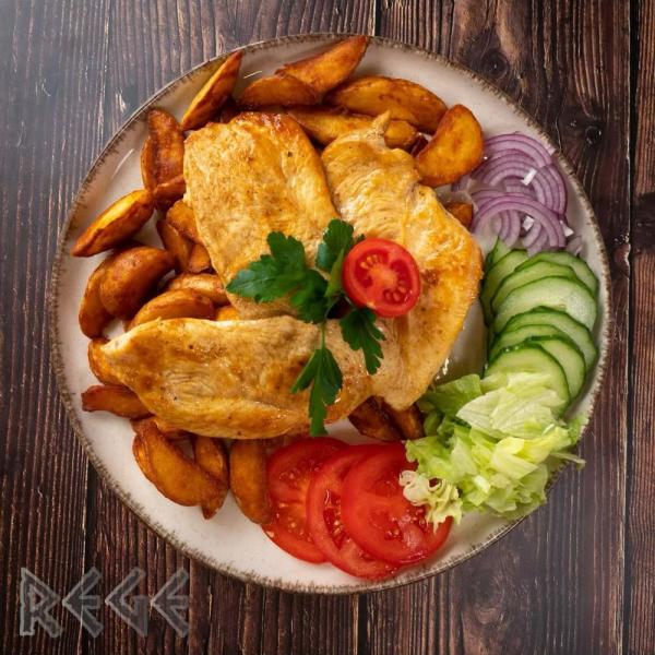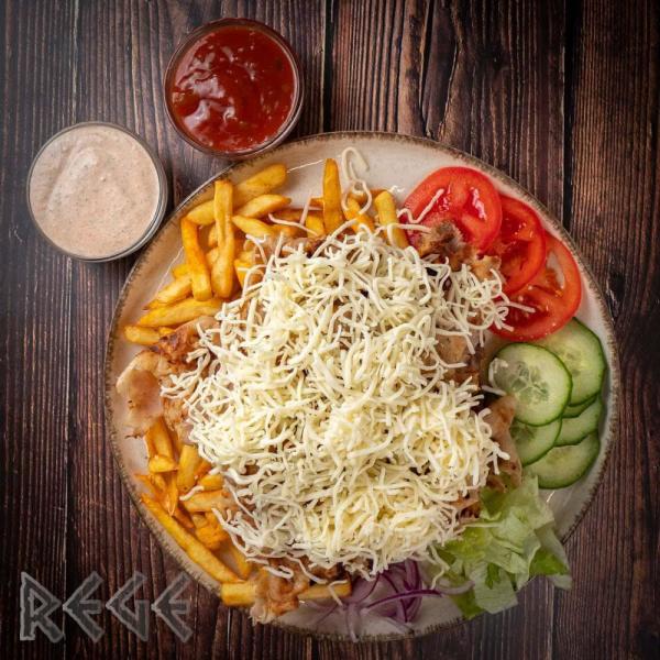 gyros hús csirkecombfiléből, jégsaláta, kígyóuborka, paradicsom, lilahagyma, reszelt trappista sajt a normál gyroshoz képest másfélszeres adagokkal, választható körettel, választható öntettel -