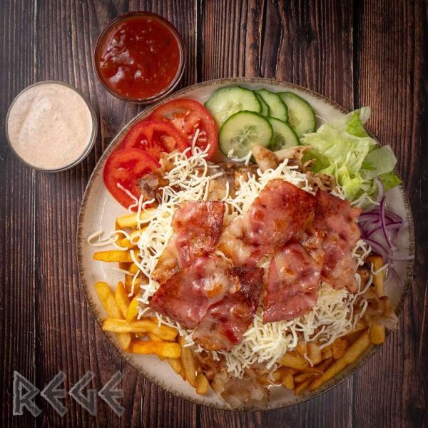 gyros hús csirkecombfiléből, bacon, jégsaláta, kígyóuborka, paradicsom, lilahagyma, trappista sajt választható öntettel -