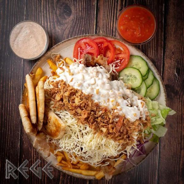 hasábburgonya, gyros hús csirkecombfiléből, jégsaláta, kígyóuborka, paradicsom, lilahagyma, reszelt trappista sajt választható öntettel -
