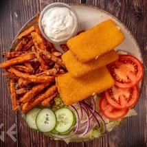 édesburgonya hasáb, gyros hús csirkecombfiléből, jégsaláta, kígyóuborka, paradicsom, lilahagyma választható öntettel -